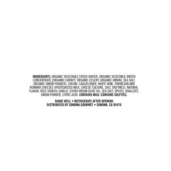 Ingredients: Cream, Organic Vegetable Stock (water, organic vegetable broth concentrate [organic carrot, organic celery, organic onion], sea salt, organic onion powder), Cauliflower, White Wine, Natural Flavor, Parmesan and Romano Cheeses (pasteurized milk, cheese culture, salt, enzymes), Extra Virgin Olive Oil, Garlic, Rice, Starch, Sea Salt, Spices, Onion Powder, Shallots, Citric Acid.
