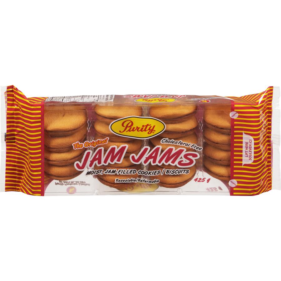 Purity Jam Jams are a Newfoundland institution! This moist sponge cookie is sandwiched together with a tasty apple-raspberry jam filling. Made with all-vegetable shortening. Perfect alone or with your favourite cup of tea!